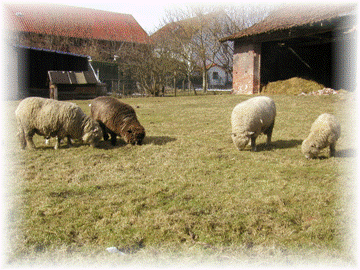 R y e l a n d S c h a f e, d i e T e d d y b ä r e n u n t e r d e n S c h a f e n Die Ryeland Schafe sind eine alte Schafrasse aus Großbritannien. Die ältesten gesicherten Hinweise stammen aus dem zwölften Jahrhundert aus Herfordshire. In einigen Urkunden ist dort der Handel mit der Wolle der Ryelands beschrieben. Im Jahre 1903 gab es nur noch fünfzehn reinrassige Ryelands. Bis zum Jahre 1922 erhöhte sich der Bestand auf 80 Tiere, und in den folgenden Jahren konnten sogar wieder einige Tiere nach Australien und Neuseeland exportiert werden. Inzwischen gibt es auch eine Handvoll Züchter die diese wunderschönen Schafe in Deutschland züchten. Seit dem Herbst 2005 halten wir nun zwei Auen in weiß, je einen braunen und einen weißen Bock. Im Februar 2006 wurde unser erstes Bocklamm geboren. Wir hoffen, dass wir dieses Jahr noch ein oder zwei Auenlämmer bekommen. |